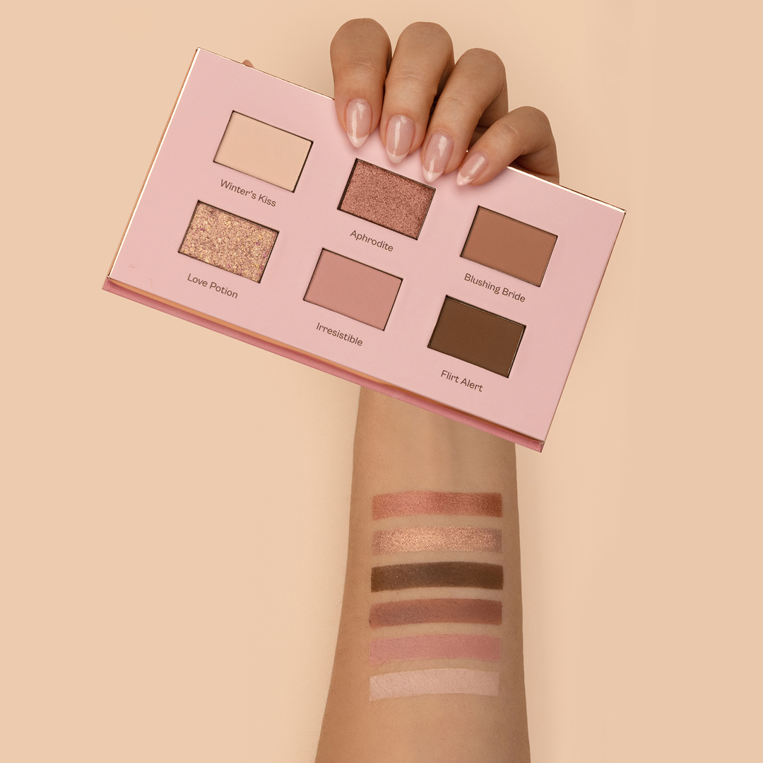 See the world through rose-coloured eyelids with the lovely tones of TOUJOURS Pink Palette: Winter’s Kiss, Aphrodite, Blushing Bride, Love Potion, Irresistible, and Flirt Alert.